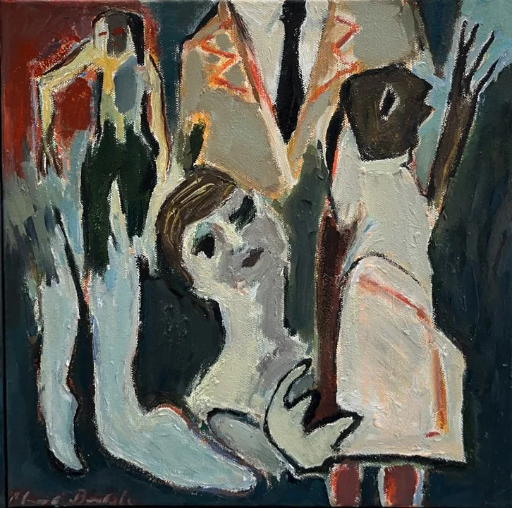 Working in oil and collage Margot Bandola’s expressionistic painting explores the absurd and unfathomable - providing a news bulletin from a shrouded ether world. Peppered with nocturnal characters emerging from the subconscious her paintings evolve twilight darknesses to reveal a pertinent fact ; everyone plays a role in the somnambulist state. Using colour, rhythm and texture she dynamically juxtaposes the savage and wry revealing the inner and outer space in the cerebellum jungle from a feminist point of view.